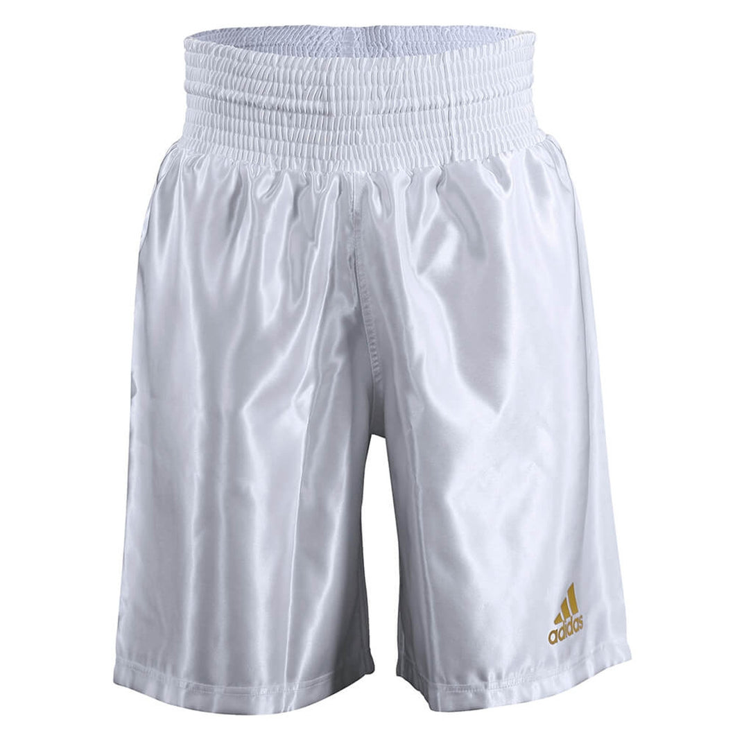 Adidas Poly Satin Boxing Shorts are made from 100% Polyester Satin. They feature a large elasticated waistband with cord tightening and have the Adidas logo printed to the front left leg in contrasting colours.